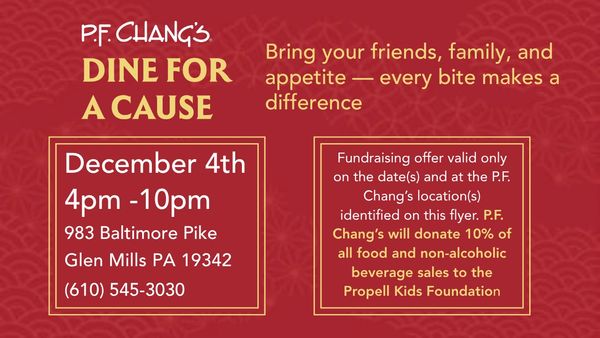 Support local kids while enjoying a great meal! Join Propell Kids Foundation for a Dine & Donate event at P.F. Chang’s in Glen Mills, where a portion of all sales will go directly to programs that help children in our community thrive.